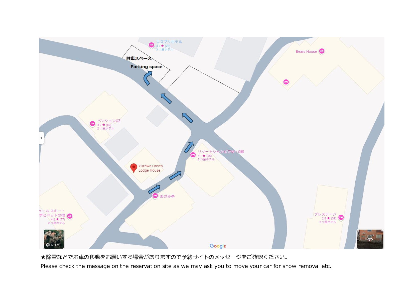 ご滞在中に除雪などでお車の移動をお願いする場合がございますので、予約サイトのメッセージをご確認ください。