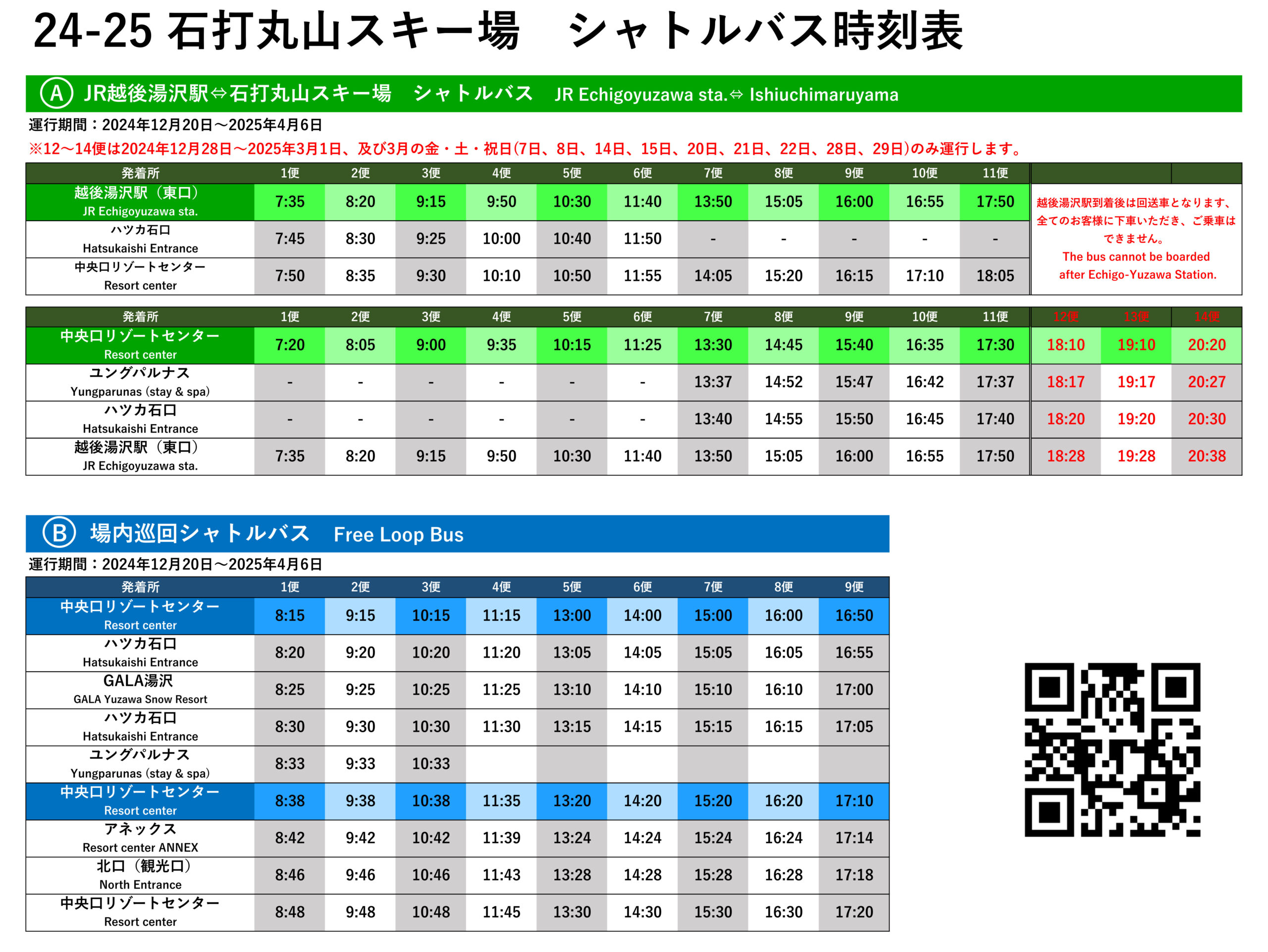 JR越後湯沢駅東口バスロータリーより、冬季営業期間中は毎日無料のシャトルバスを運行しております。