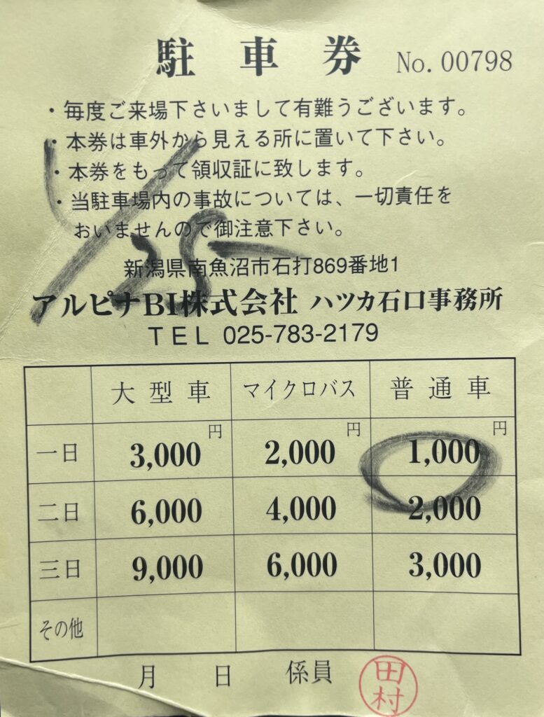 グリーンシーズンは無料ですが、冬シーズンは普通車1泊1,100円で、宿泊者専用の駐車場となります。