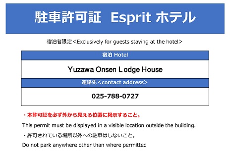 お部屋に入ってすぐのテーブルに駐車許可証がありますので、「Esprit ホテル」さんの駐車スペースをご利用の方は許可証を必ず