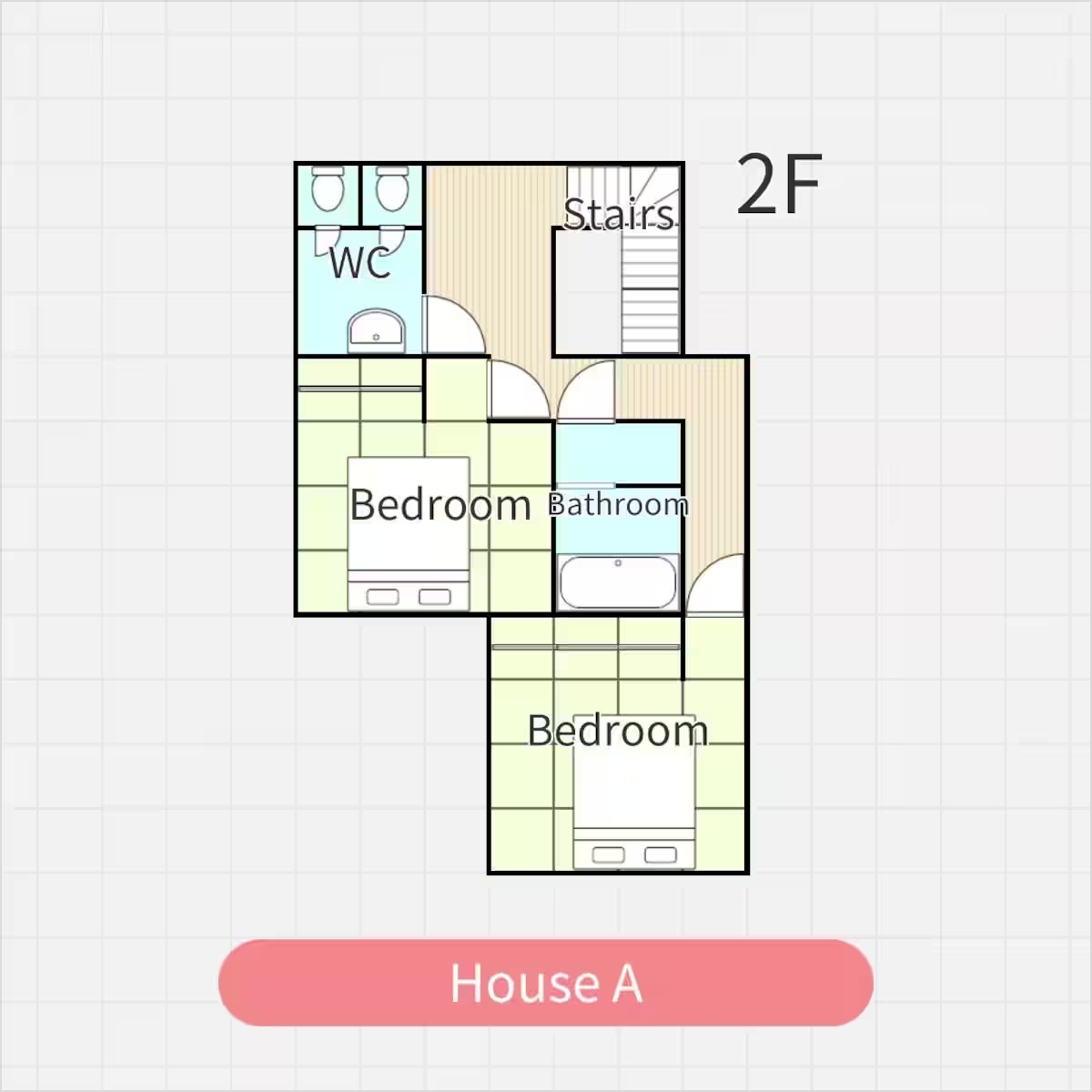 2F | フルバスルーム・洗浄機能付きトイレ(2つ)・寝室 2・寝室 3 |