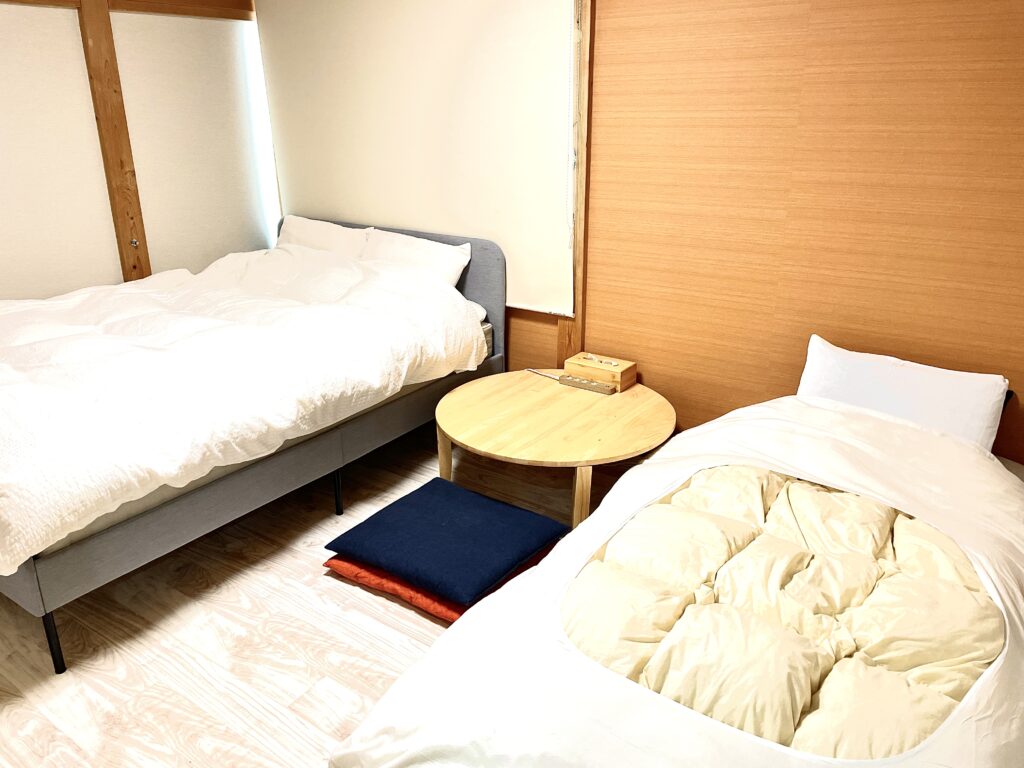 | 寝室 3 | 2F 和室8畳相当 ダブルベッド×2 布団セット×1 エアコン完備 丸テーブル 定員 5名 |