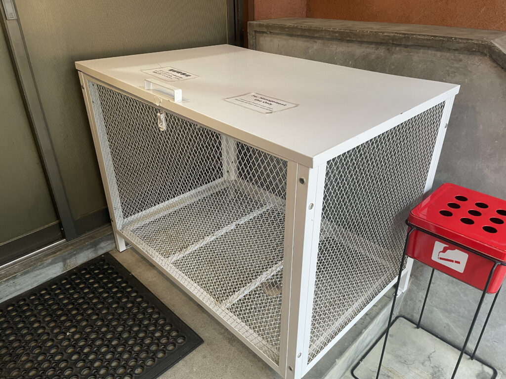 エントランス入口にある白いゴミ収集カゴは、スタッフが